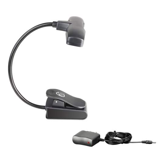 Die SLED10 ist eine sehr kompakte und handliche Notenpultleuchte mit geschütztem Design. Die 10 lichtstarken und effizienten LEDs sind in 2 Helligkeitsstufen einzeln schaltbar. Auch der Lichtkegel ist variabel einstellbar dank des flexiblen 220mm langen Schwanenhalses.