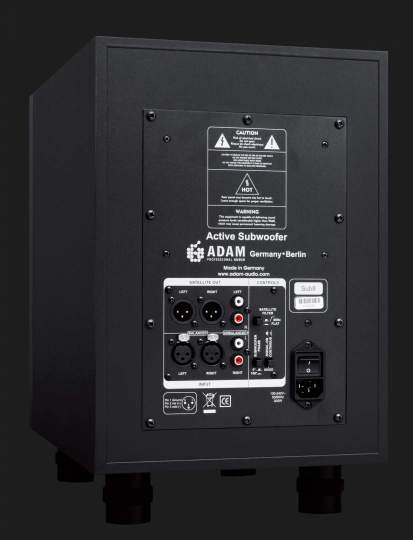 Auf der Vorderseite befinden sich zwei Motorpotentiometer, mit denen die Übergangsfrequenz und die Lautstärke eingestellt werden können. Eine mitgelieferte Fernbedienung ermöglicht die Einstellung dieser Regler bequem vom Hörplatz aus.