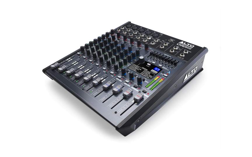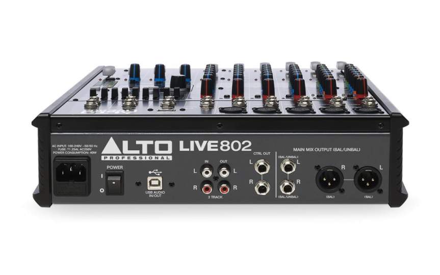 Alto Professional Live 802 bringt als 8-Kanal Mixer mit zwei Bussen alles für den optimalen Mix mit. Durch flexible Routing-Möglichkeiten und einer Bandbreite an integrierten DSP Tools fügt sich Live 802 in nahezu jede beliebige Live Performance ein. Live 802 enthält fünf symmetrische XLR Eingänge mit zuschaltbarer Phantomspeisung, 3-Band EQs für zusätzliche Klanggestaltung, zwei Aux Sends pro Kanal für externe Effekte, sowie einen 9-Band Grafik-EQ für Main- oder Monitorausgänge. Ein Kopfhörerausgang mit unabhängiger Pegelregelung, sowie 60 mm Fader mit LED Anzeigen erlauben eine präzise Kontrolle des Signals und bieten optisches Feedback. Dank seiner vielfältigen Anschlussmöglichkeiten ist Live 802 für jedes Event gerüstet.