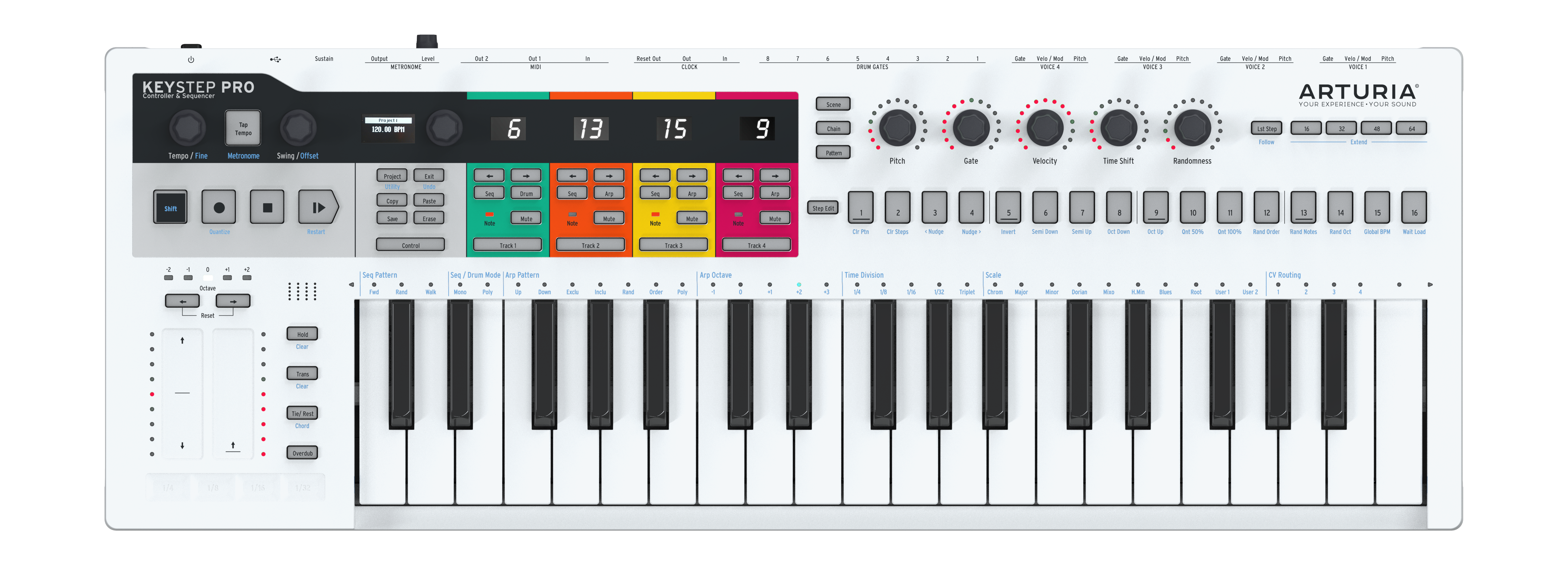 KeyStep Pro ist ein 37-Tasten-MIDI-Controller und mehrkanaliger polyphoner Sequenzer in einem. Er ermöglicht es Ihnen, ihre modularen Rigs, Outboard-Synths und ihr Software-Studio gleichzeitig zu steuern. Die 4 unabhängigen polyphonen Sequenzer-Spuren geben Ihnen die volle Kontrolle über Ihre Instrumente. Die erste Spur kann auch als Drum-Sequenzer mit 16 Parts genutzt werden. Er ist unglaublich intuitiv, verfügt über unvergleichliche Anschlussmöglichkeiten und lässt selbst komplexe Performances zum Kinderspiel werden.