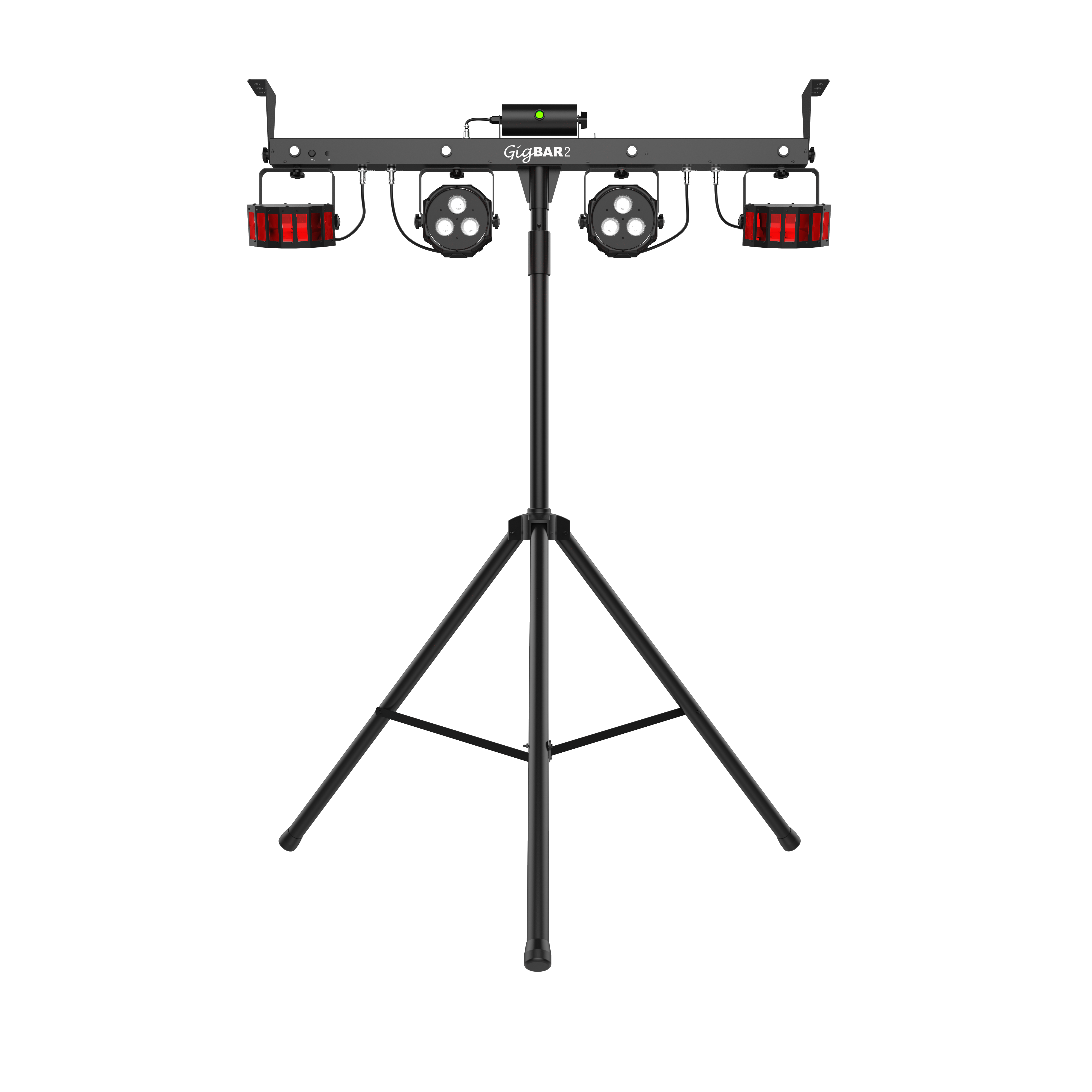 Das GigBAR 2 ist das ultimative 4-in-1-Beleuchtungssystem im Pack-n-Go-Format. Inkludierte UV-Wash-Scheinwerfer und Stroboskop-LEDs ermöglichen mehr Effekte für jede Show! Die GigBAR 2 beinhaltet des Weiteren zwei LED-Derby-Scheinwerfer, LED-Wash-Scheinwerfer und eine Lasereinheit. Alles zusammen ist auf der GigBAR 2 vormontiert, so dass der Aufbau kinderleicht und schnell von der Hand geht. Einfach auspacken, auf das mitgelieferte Stativ setzen, festschrauben, fertig. Integrierte, automatisierte und Sound-To-Light- Programme erlauben einen schnellen Start und das rückseitige Display erlaubt eine einfache Programmierung aller Funktionen. Mit der mitgelieferten IRC-6-Fernbedienung, sowie dem mitgelieferten, kabellosen Fußschalter lässt sich die GigBAR 2 ganz einfach kabellos steuern. Natürlich ist auch eine Ansteuerung via DMX möglich. Mehrere Einheiten können im Master/Slave-Modus gekoppelt werden. Mit dem im Lieferumfang enthaltenen Stativ, dem kabellosen Fußschalter und der Tragetasche lässt sich jeder Gig im Handumdrehen bewältigen dank der GigBAR 2.