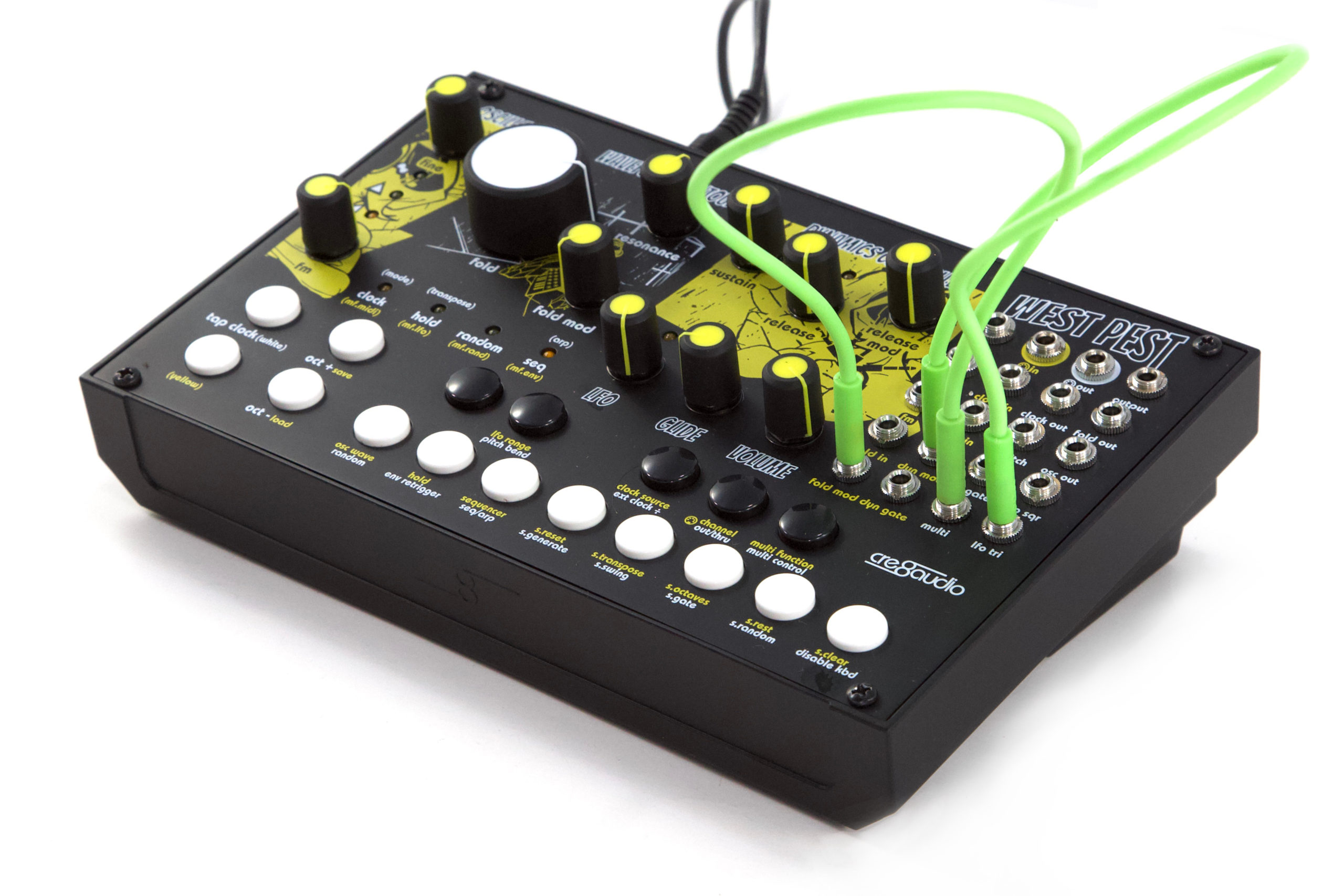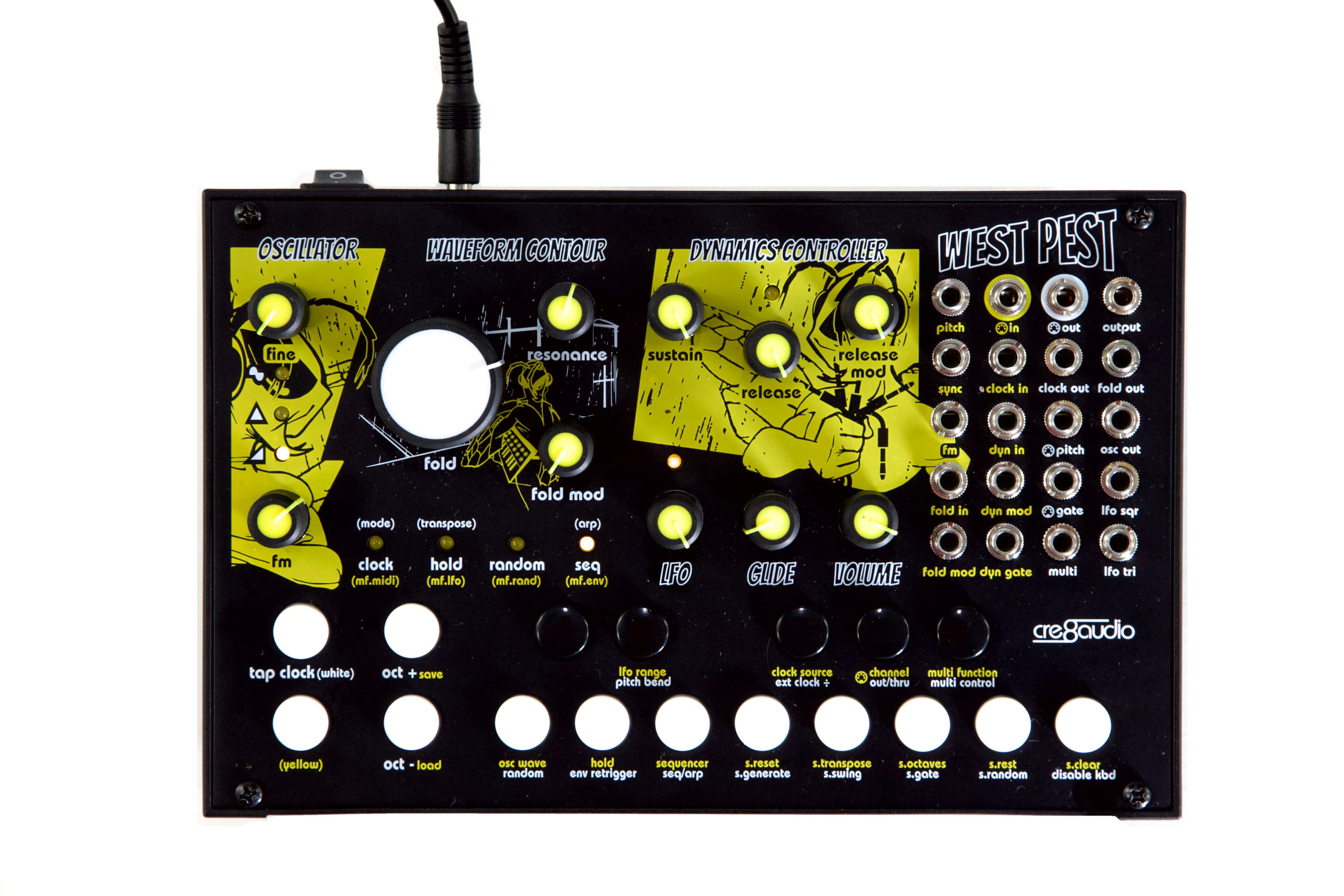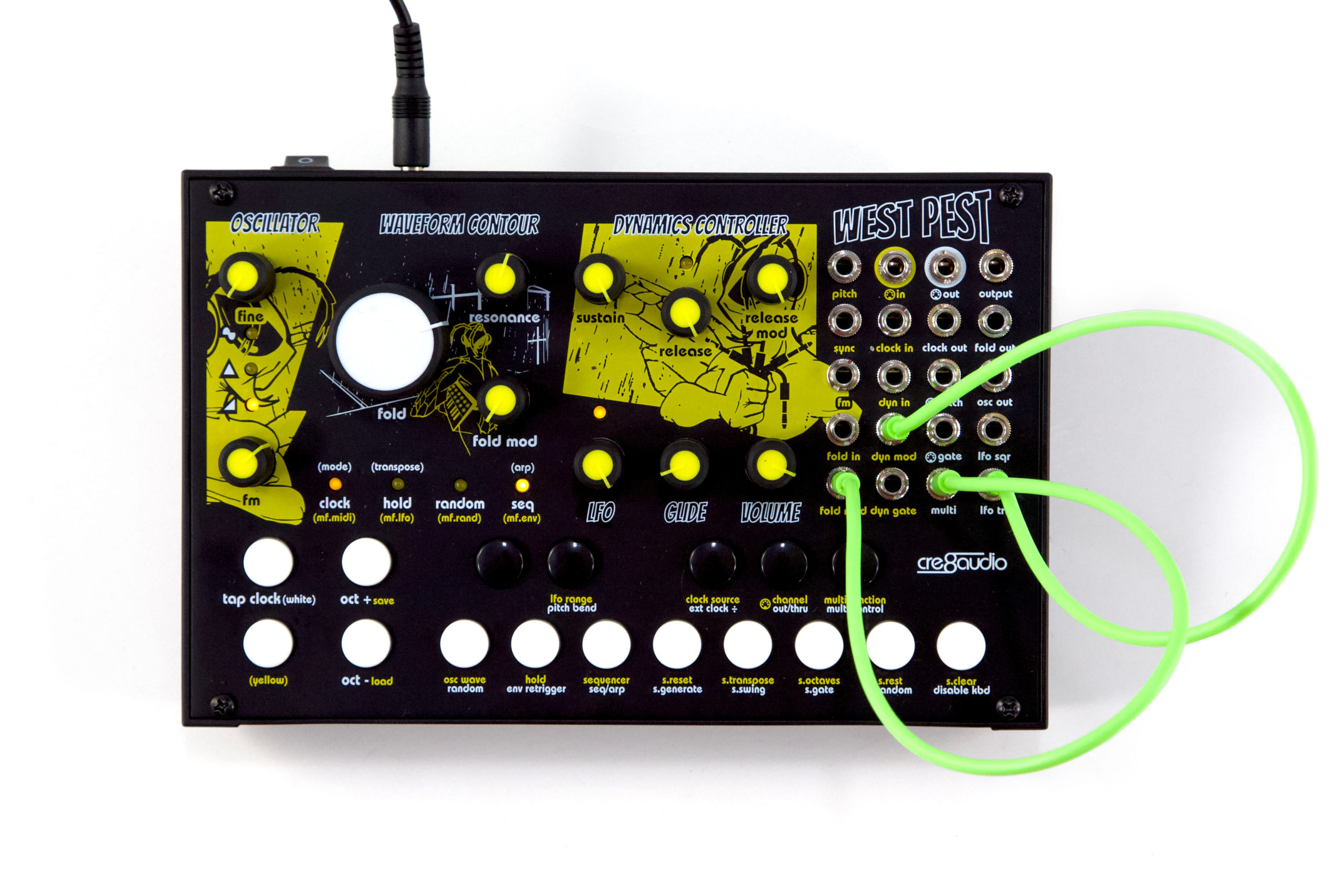 West Pest ist semi-modular aufgebaut und verfügt über 8 verschiedene patchbare Module (Oszillator, Wave Contour, Dynamics Controller, LFO, Multi-Mod-Tool, Sequenzer, MIDI/CV-Wandler und Minitaster-Klaviatur) mit sage und schreibe 18 Eurorack-kompatiblen Patch-Punkten zum Anschluss an sich selbst und andere Geräte.