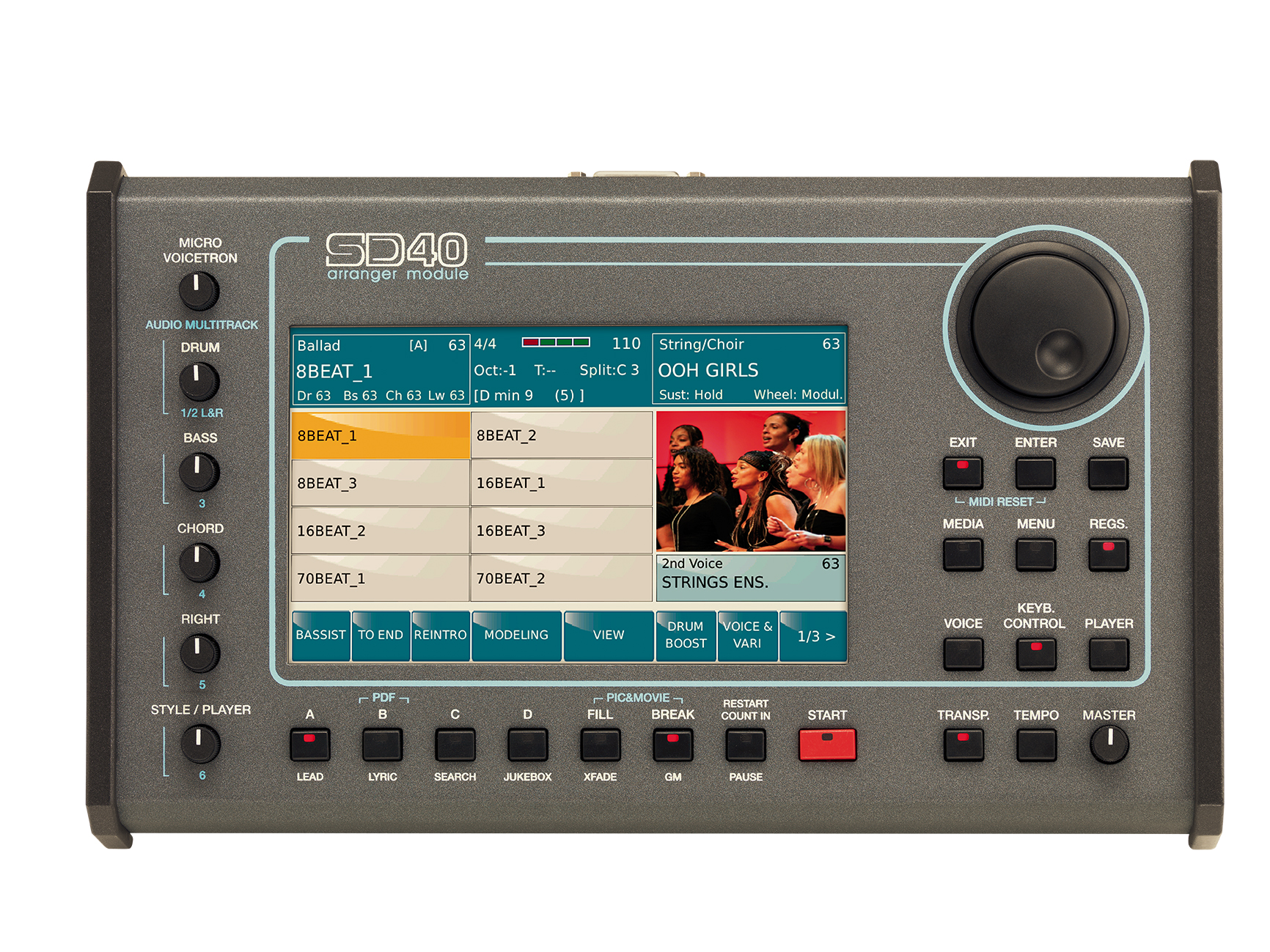 Die SD40 Sound Generation bietet eine enorme Auswahl an Orchesterstimmen mit einem Stereo Grand Piano, neuen Brass und Sax Bereichen, neuen Gitarren und Bässen nach der Multi- Layer- Technik, zuzüglich der neuen Pads, Strings, Accordions, Synth, Electric Pianos und Sondereffekte. Ebenfalls zur Verfügung steht eine reiche Auswahl an Tonewheel-Orgelklängen mit einer getreuen Reproduktion des klassischen slow-fast Rotary-Effekts. Darüber hinaus werden 49 DRUM KITS und über 300 LATIN Percussion GROOVES geboten, zusammen mit 368 Preset Voices, aufgeteilt in 12 Familien mit einem detaillierten Editing Menü, 2nd Voice, 3 Sound Layerings und User Voice Möglichkeiten. In der VOICE LIST können Sie Ihre beliebtesten 32 Stimmen abspeichern.