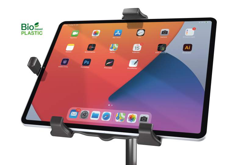 Universeller Tablet-Halter mit einer praktischen Klemmmechanik für alle Tablets mit einer Größe von ca. 10 bis 16. Die Tablet-Halterung ist aus biobasiertem Kunststoff gefertigt. Diese Kunststoffe enthalten einen Anteil von über 50% bis zu 100% an nachwachsenden pflanzlichen Rohstoffen. Die Nutzung nachwachsender Rohstoffe trägt dazu bei, die begrenzten Erdölvorräte zu schonen und schädliche CO2-Emissionen zu verringern. Mehr Infos zu den biobasierten Kunststoffen unter: biokunststoff.k-m.de. Der Klemmbereich des Tablet-PC-Stativhalters liegt zwischen 158 und 280 mm. Besonders geeignet ist der Halter auch für den Einsatz von Tablets mit Schutzhülle oder Case bis zu einer Stärke von 20 mm. Die übergreifenden Klemmbacken mit integrierter Gummiauflage garantieren einen sicheren Halt und eliminieren unerwünschte Vibrationsgeräusche. Die Funktion der Bedienungselemente am Gerät wird dabei nicht beeinträchtigt. Ein verstellbarer Haltewinkel mit Filzauflage sorgt für zusätzliche Sicherheit bei vertikaler Ausrichtung des Tablet Halters, sodass ein Herausfallen des Tablet-PCs selbst bei hoher Beanspruchung verhindert wird. Der Halter ist neigbar und ermöglicht jedem Anwender seine individuelle Positionierung. Selbstverständlich kann der Tablet Halter zwischen Hoch- und Querformat kurzerhand gedreht werden, wobei ein selbstständiges Drehen verhindert wird. Egal ob auf der Bühne, im Proberaum oder zu Hause - dank des 3/8 bzw. 5/8 Innengewindes kann der Halter beispielsweise auf jedes Mikrofonstativ schnell und einfach aufgeschraubt werden.