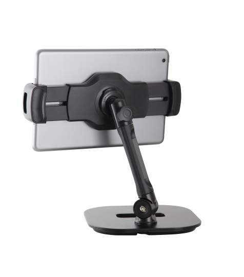 Stylisch und funktionell präsentiert sich das Tischstativ für Smartphones und Tablets. Der Halter kann Geräte mit einer Größe von 10,2 bis 13" aufnehmen. Das entspricht einer Klemmbreite von 130 bis 224 mm. Die Klammern und die Anlagefläche sind mit rutschfestem Gummi überzogen und sorgen somit für zusätzliche Sicherheit und einen schonenden Grip. Die Halterung lässt sich über einen Kugelkopf individuell und stufenlos einstellen. Der Auslegerarm kann um 360° gedreht werden und ist in der Neigung von 0 bis 150° stufenlos einstellbar. Die robuste Fußkonstruktion besteht aus einer Metallplatte und einem Unterbau mit 4 rutschfesten Füßen. Die Unterkonstruktion hält zudem einen Inbusschlüssel bereit und ermöglicht eine komfortable Kabeldurchführung.