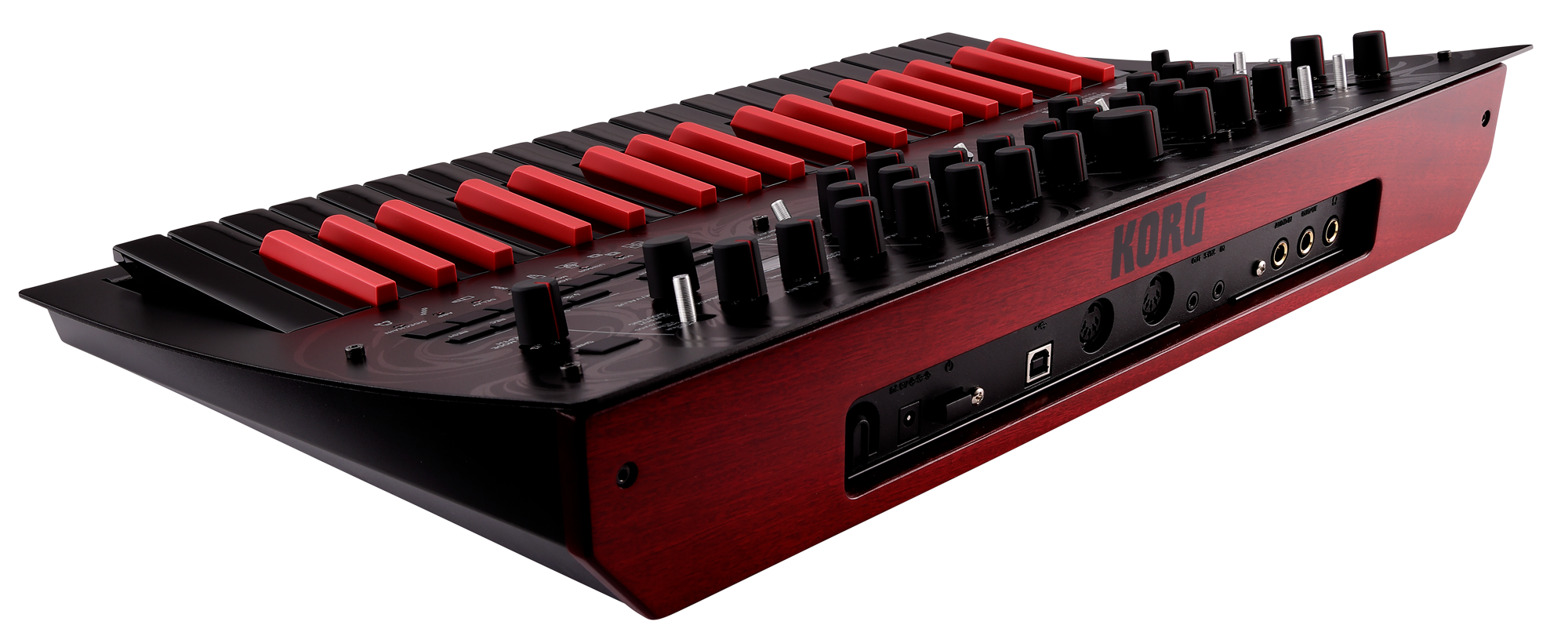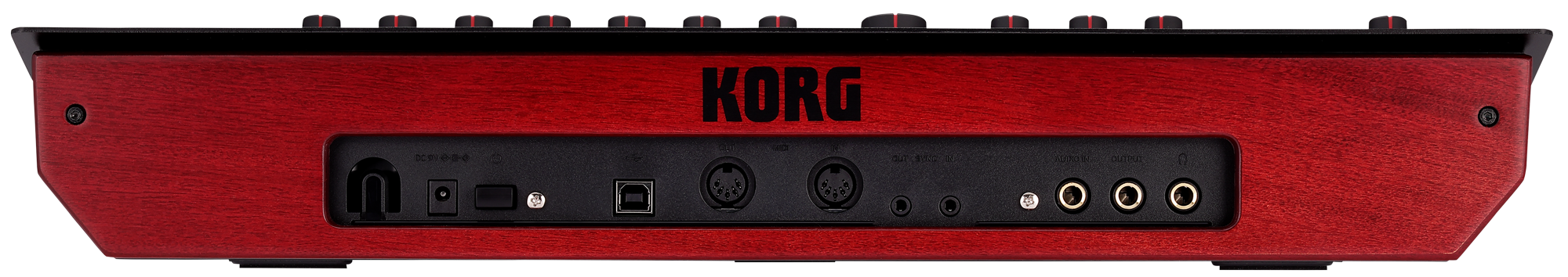 Das Bedienfeld des minilogue bass weist einen einzigartigen Charakter auf, der durch die visuelle Darstellung eines anschwellenden Synth-Bass-Sounds inspiriert ist. Die invertierte Tastatur mit schwarzen und roten Tasten sorgt dafür, dass das Instrument in jeglichem Umfeld sofort ins Auge springt. Die ebenfalls rot gefärbte Holzrückseite rundet das auffällige und stylische Design des minilogue bass perfekt ab.