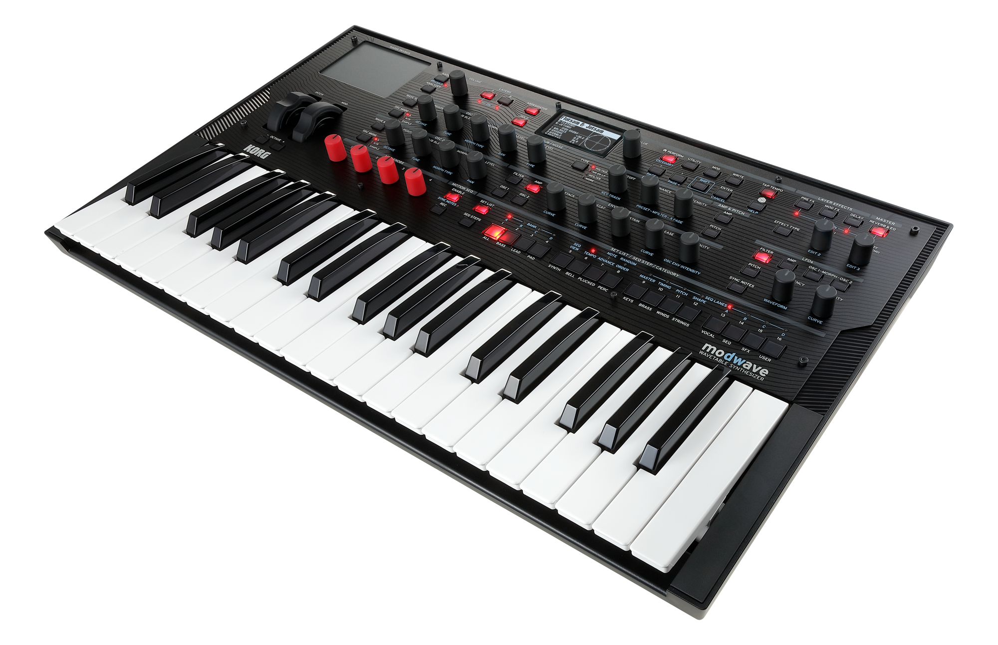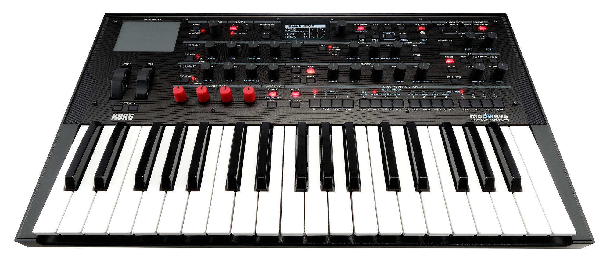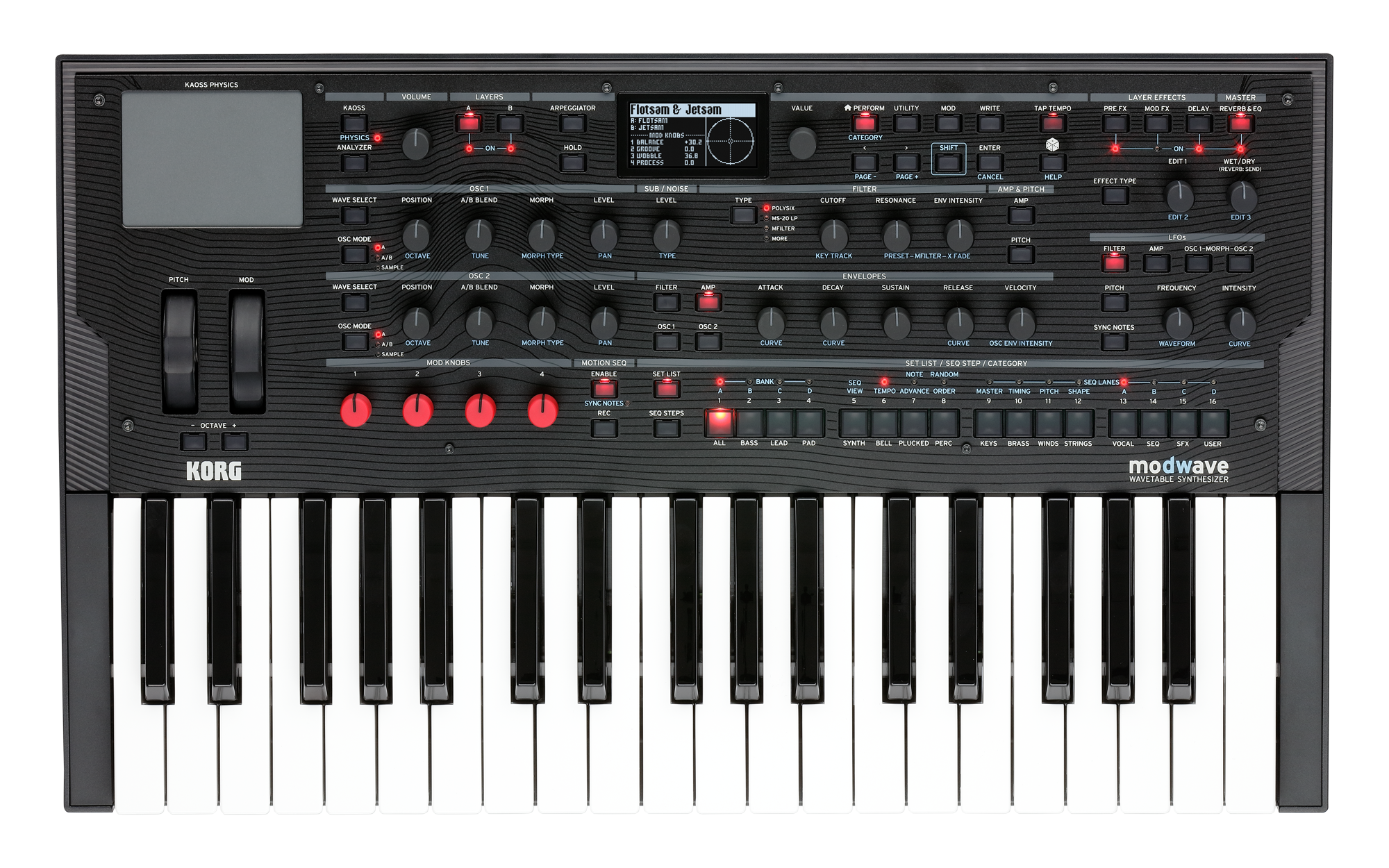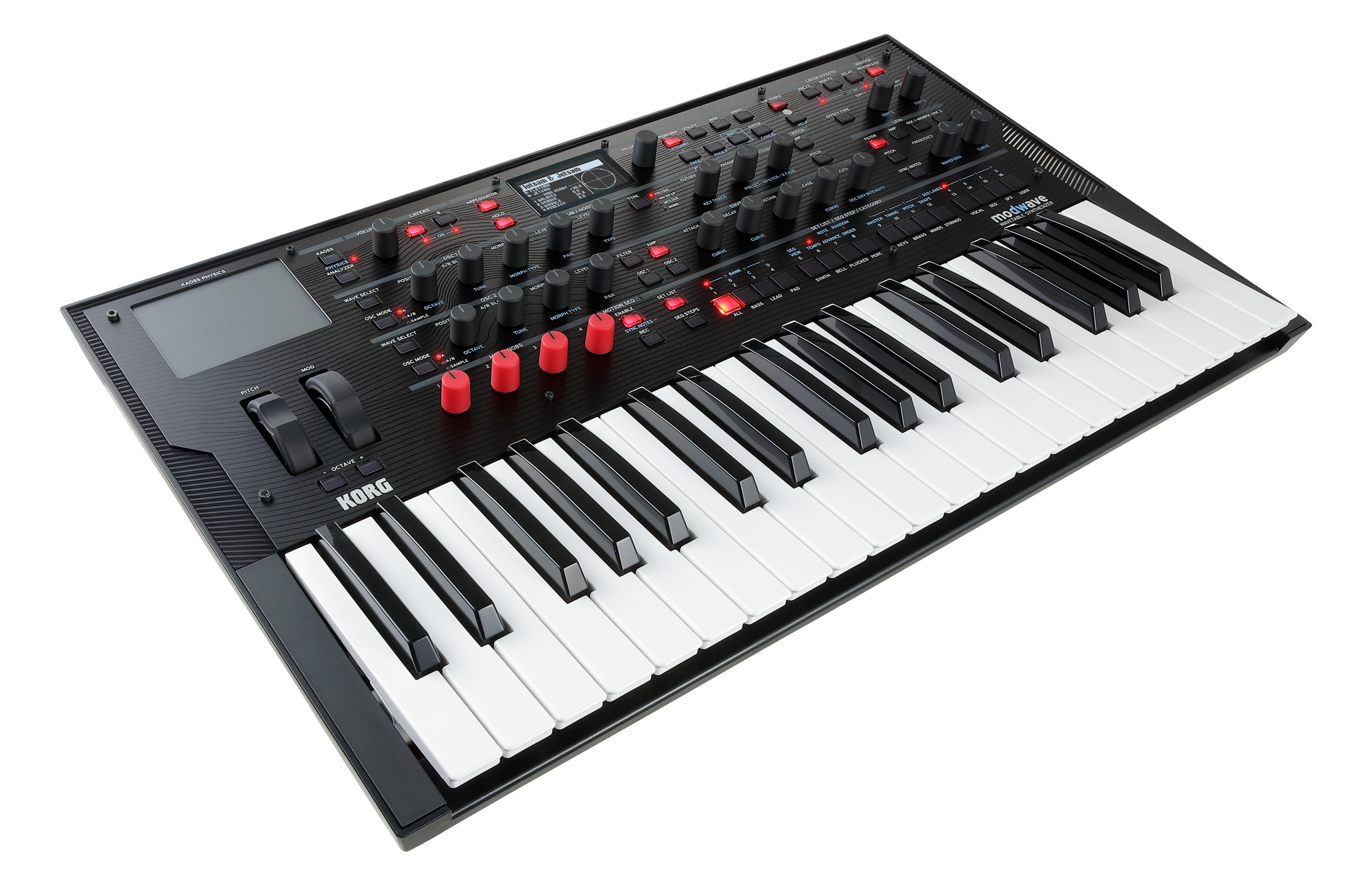 Die auf dieser Art und Weise neu entstehenden aggressiven Bässe, Lead-Sounds oder auch Flächenklänge lassen sich durch die 4 MOD-Regler und viele weitere Bedienelemente auf der Oberfläche des modwaves bis ins kleinste Detail bearbeiten und dem eigenen Geschmack anpassen. Der modwave verfügt neben zwei fürstlich ausgestatteten Wavetable-Oszillatoren auch über einen Suboszillator/Rauschgenerator. Neben den Filtern lassen sich auch weitere Parameter mit einem hochflexiblen Modulationssystem, 4 steuerbaren Hüllkurven, 5 LFOs, 2 Modulationsprozessoren, 2 Notenskalierungen sowie mehrzeiligen Motion-Sequenzen und Kaoss Physics" beeinflussen.