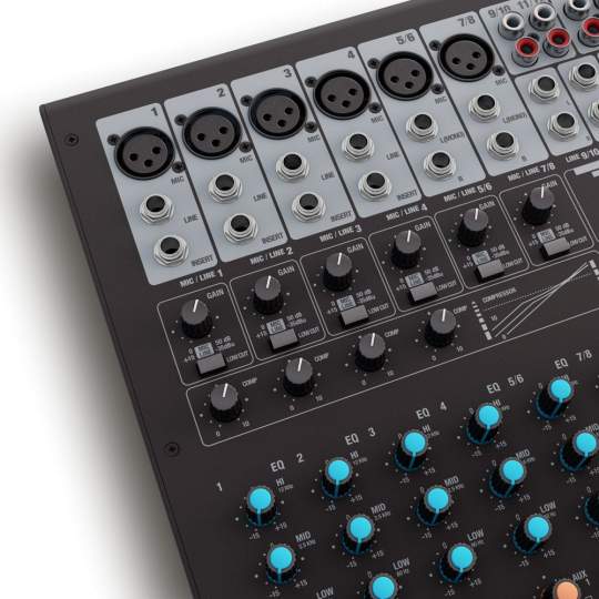Vier Mikrofonkanäle können mit dem eingebauten Compressor für eine wirkungsvolle Dynamikregelung separat bearbeitet werden, zwei weitere können alternativ als Stereo-Line-Kanäle benutzt werden. Die übrigen Stereokanäle sind mit 2-Band-EQs ausgestattet.
