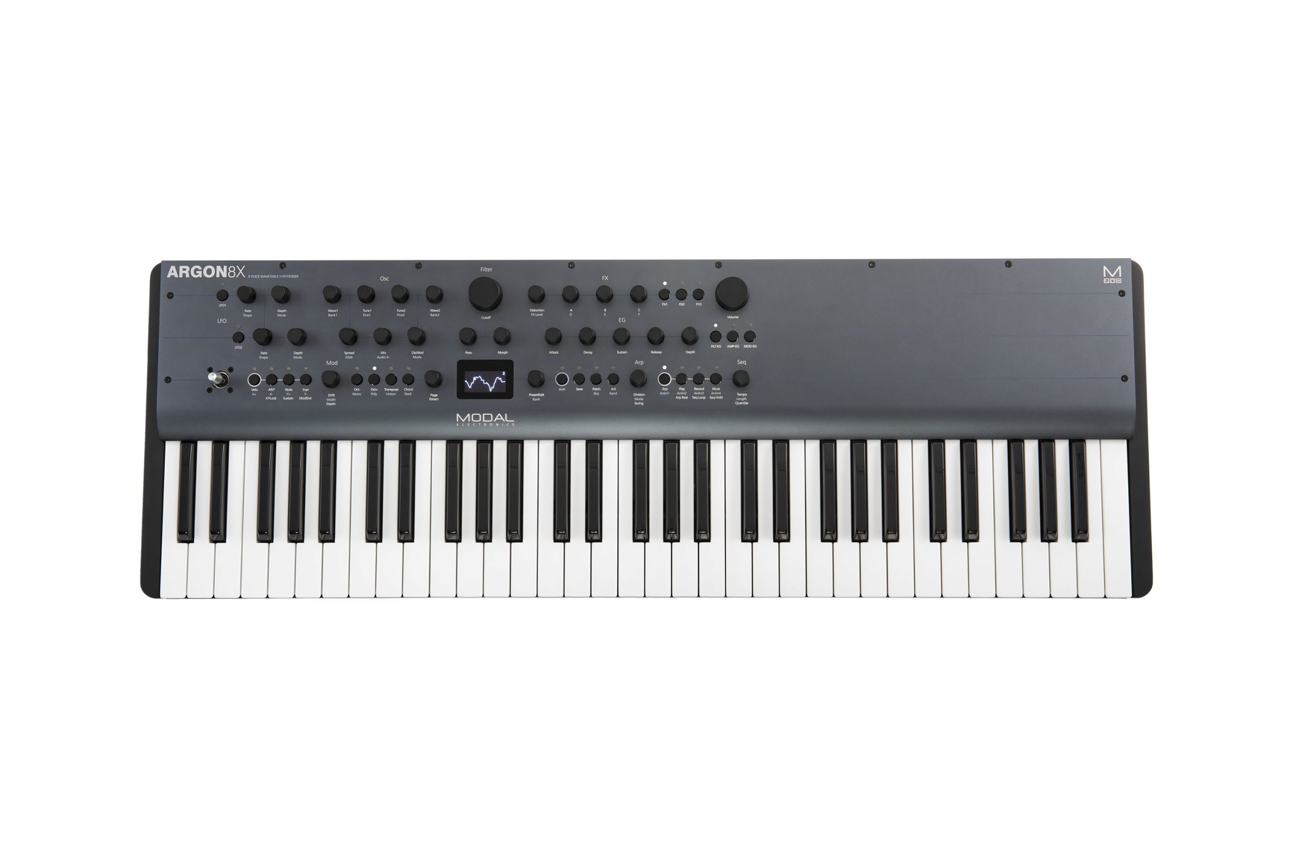 Mit dem ARGON8X präsentiert der britische Hersteller MODAL Electronics einen 8-stimmig polyphonen Wavetablesynthesiser mit 32 Oszillatoren, revolutionären Features und Direktzugriff auf alle klangformenden Parameter. Über die 61 Tasten in Standardgröße lassen sich seine Klänge anschlagdynamisch und - via Aftertouch - auch besonders expressiv spielen. Einen entsprechenden, optionalen Controller vorausgesetzt, unterstützt der ARGON8X außerdem MPE (MIDI Polyphonic Expression) für nochmals ausdrucksstärkere Performances. Das gestochen scharfe OLED Display zeigt zu jeder Zeit die Einstellungen des gerade angewählten Reglers und seine Auswirkungen auf den Klang an. Insgesamt stehen 180 handverlesene Wavetables in 36 Bänken zur Auswahl, die sich ineinander überblenden lassen. Außerdem können diese durch 32 Modifier wie Waveshaper, Wavefolder und Phaseshaper zusätzlich in die Mangel genommen werden. Das morphbare Multimode-Filter formt den Klang weiter und verleiht ihm auf Wunsch die nötige Prise analoger" Wärme. Mit dem integrierten Arpeggiator und dem polyphonen 64-Step-Sequencer lassen sich die Sounds nach Herzenslust animieren und anschließend mit bis zu 4 hochwertigen Effekten gleichzeitig veredeln. Über die kostenlose, plattformübergreifende MODALapp können außerdem alle Funktionen des Synths bequem am Bildschirm editiert werden.