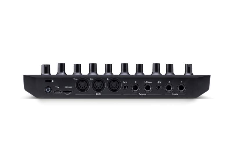 Über die fünfpoligen MIDI-Buchsen In, Out, Thru und einem analogen Sync-Ausgang stellst du die Verbindung zu deinem Studio her. Die beiden Audioeingänge kannst du mit Effekten versehen und diese über den Stereoausgang oder mit Kopfhörern abhören.