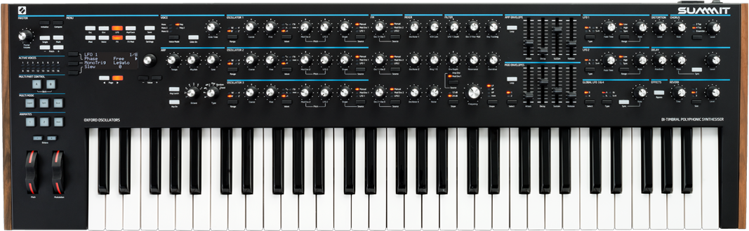 Summit verdoppelt die Leistung der digitalen New Oxford Oszillatoren aus Peak auf eine bis zu 16-fache Polyphonie, verteilt auf zwei Multiparts. Dazu werden etliche neue Funktionen und eine erstklassige Klaviatur mit fünf Oktaven ergänzt. Dieser Synthesizer ist weitaus mehr als die Summe seiner Teile. Er gibt selbst anspruchsvollen Produzenten und Livekünstlern die nötige Leistung an die Hand, um beeindruckende Bässe, Leads, Arpeggios, Pads, Effekte und weitere Sounds zu gestalten und zu spielen.