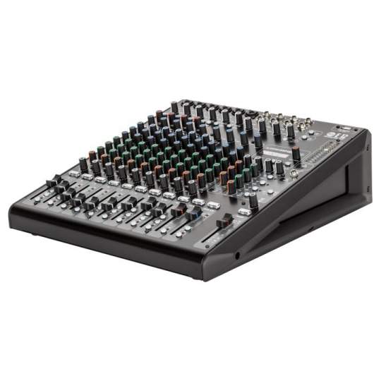 Das E 12 verfügt über 6 Mikrofonvorverstärker in Studioqualität mit einem Gainumfang von 54 dB und XLR/Klinke-Kombibuchsen. Zwei Line-Eingänge können auf Hi-Z umgeschaltet werden. Die Eingangs-Sektion umfasst zusätzlich drei Stereo-Line-Eingänge und einen Stereo-Return. Die Eingangskanäle 1 bis 4 sind jeweils mit einem Kompressor mit Einzelregler ausgestattet. Die 6 Mono-Kanäle verfügen jeweils über einen 3-Band-EQ in Form von Shelving-EQs für Höhen und Bässe und eines semiparametrischen Mitten-EQ mit einstellbarer Mittenfrequenz und zweistufig schaltbarer Bandbreite. Die Stereo-Eingangskanäle verfügen jeweils über einen 3-Band-EQ.