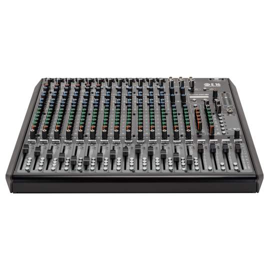 Das E 16 verfügt über 12 Mikrofonvorverstärker in Studioqualität mit einem Gainumfang von 54 dB und XLR/Klinke-Kombibuchsen. Zwei Line-Eingänge können auf Hi-Z umgeschaltet werden. Die Eingangs-Sektion umfasst zusätzlich zwei Stereo-Line-Eingänge und einen Stereo Return. Die Eingangskanäle 1 bis 6 sind jeweils mit einem Kompressor mit Einzelregler ausgestattet. Die 12 Mono-Kanäle verfügen jeweils über einen 4-Band-EQ in Form von Shelving-EQs für Bässe und Höhen und 2 semiparametrischen EQs mit einstellbarer Mittenfrequenz und zweistufig schaltbarer Bandbreite für die oberen und unteren Mitten. Die Stereo-Eingangskanäle verfügen jeweils über einen 3-Band-EQ.